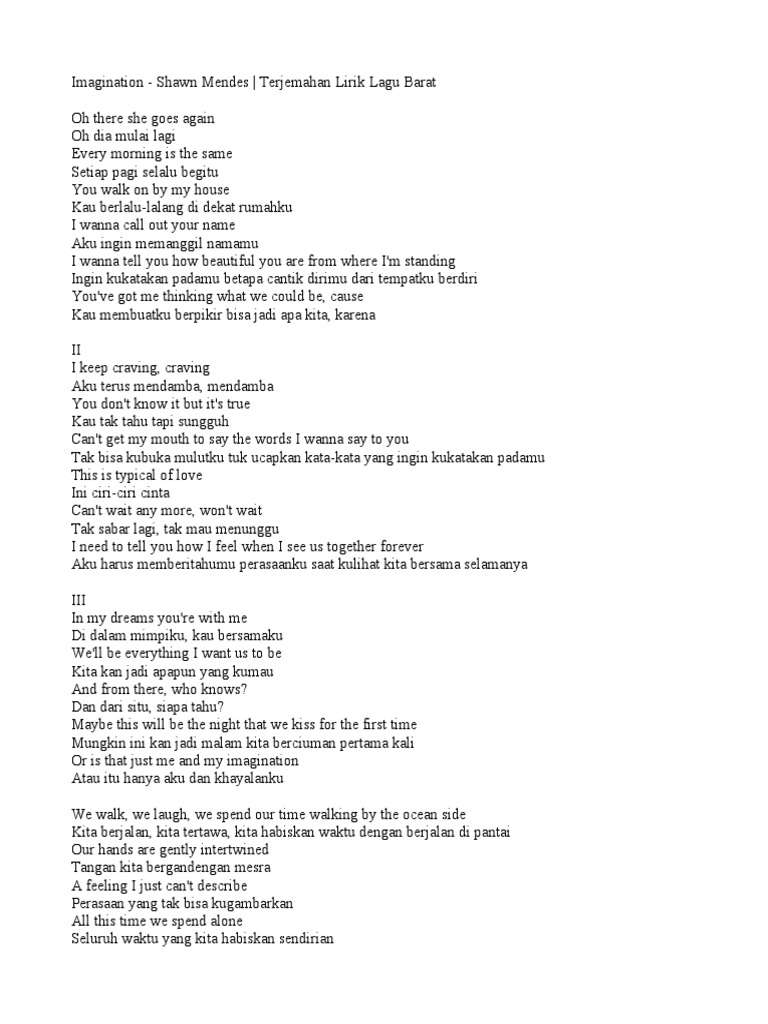 Berikut adalah lirik lagu Imagination yang dinyanyikan Shawn Mendes dan terjemahannya. Oh there she goes again. Para generasi millineal dan Z tentunya sudah tidak asing dengan lagu Imagination yang dipopulerkan oleh Shawn Mendes.